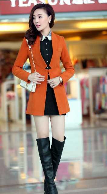 一件有领超黑色短裙,外面配上一件无领的西式外套,穿上一对黑色高筒靴,有没有觉得女人味十足,如果觉得较冷可以加上丝袜的哦,还添上一份性感。