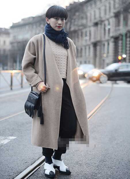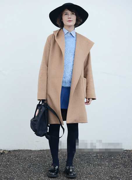 经典款的2015毛呢长款大衣,穿得时髦而大气,内搭毛衣蓬蓬短裙,添几分淑女甜美感,平底鞋搭配袜子很有少女情结,不失高挑妹子的甜美气质。