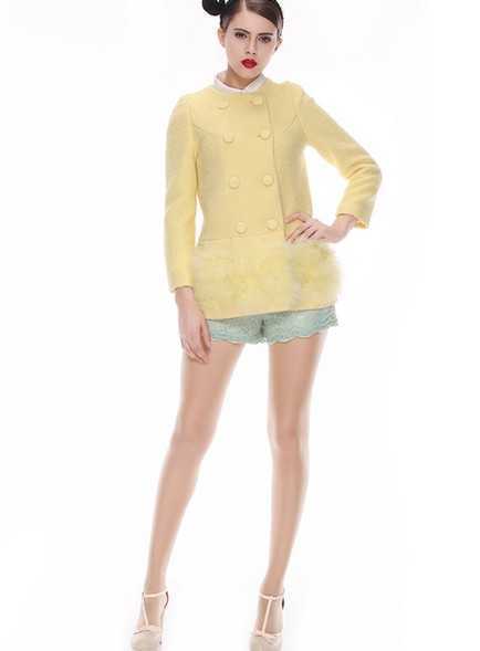 经典的双排扣皮草毛呢外套,粉嫩的黄色很青春很洋溢,奢华的皮草在下摆点缀着,穿起来分外的时尚大牌,保暖又时尚的皮草毛呢外套,穿出奢华大气女性气质范儿。