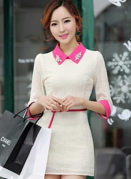春季通勤款白色连衣裙,修身的款式,显瘦与优雅气质兼备,水钻点缀着的娃娃领子,更凸显出清新时尚感,让你完美展现出女性知性优雅美。
