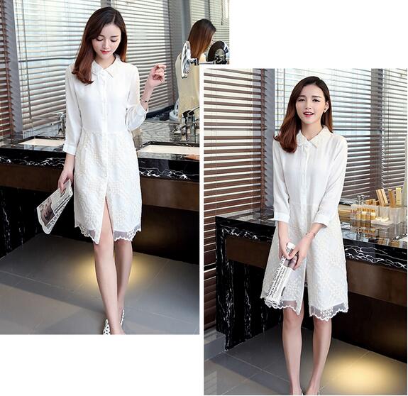 ★小编点评:时尚POLO领上的蕾丝跟衬衫下摆的蕾丝相呼应,时尚的气息随着蕾丝散发出来,这款单排多扣中长款衬衫只需搭配一双白色单鞋,小白领的时尚套装就是这么简单啦~