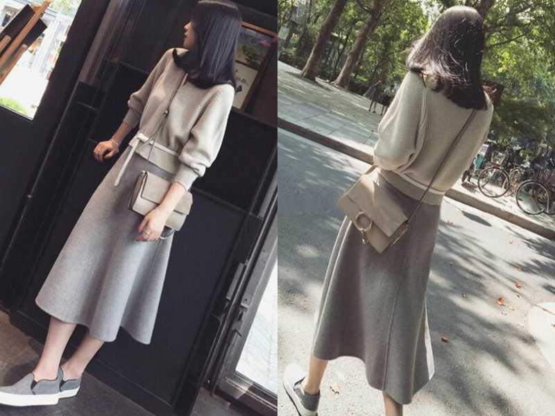 套装裙的其中一个优点就是配色方面不会出错,上衣与裙子的颜色相近,看起来很舒服,中间收腰下摆宽松的设计也很显瘦,加上包包与鞋子的颜色几乎都与套装裙相近,整体看上去大方又简约。