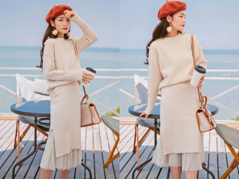 纯色系的一款冬季套装裙,上衣款式较简约,只在袖子两边绣上一排珍珠,使衣服看起来精致不少,而下身的半身裙则很有特色,裙摆下多了一层蕾丝内衬贴着小腿肚,整个身高拉长之余也显得很时尚。
