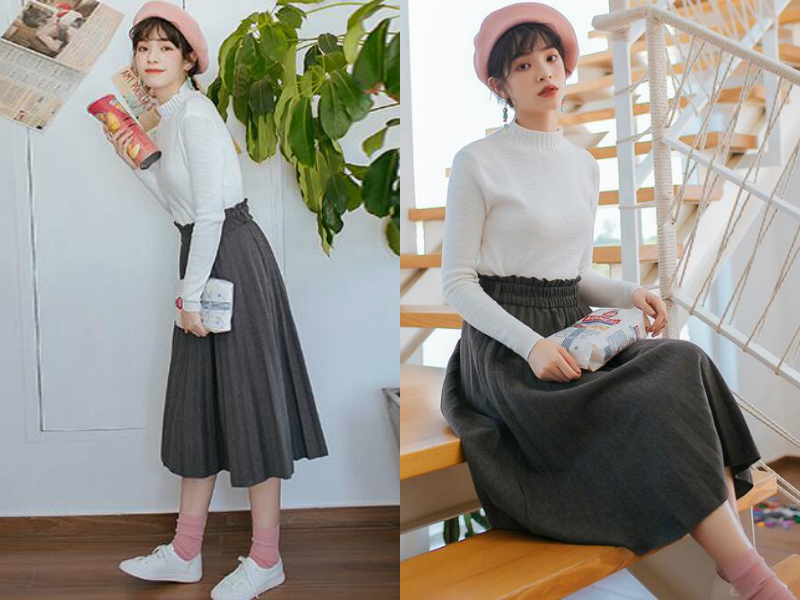 这真的是为秋冬而生的半身裙,压褶针织柔软更具有质感,松紧腰的设计更贴合腰部,修饰小蛮腰,A型的裙摆显瘦之余又展现青春活泼的风格,简约的灰色作为内搭单品也是很ok的,不会对外套的选择有太多挑剔的地方。