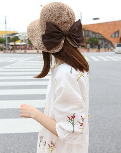 【女生遮阳帽款式2】这款超级特别的女生夏季遮阳帽不仅能随意折叠携带,而最极具特色在于帽子后沿开叉的部位,再搭配着深棕色的大蝴蝶结,让整个遮阳帽都充满了独特休闲的风格,而且也是相当百搭。