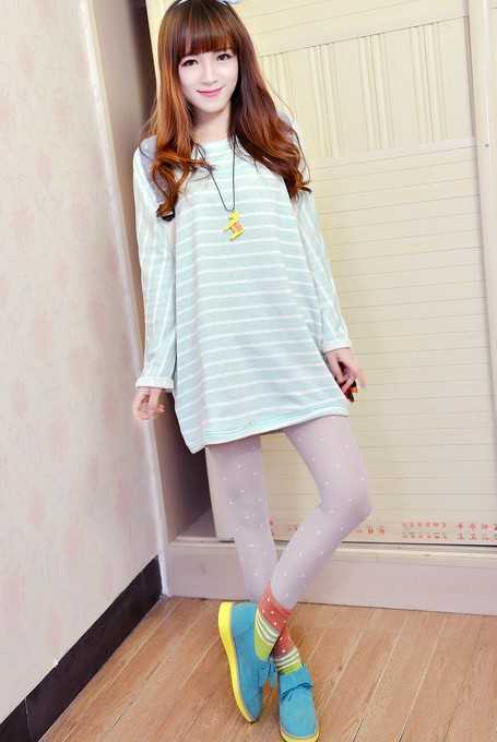 充满春季气息的条纹学院风T恤,最适合学生一族的MM们了,搭配少女气息的甜美丝袜和嫩蓝色休闲鞋,很百搭时尚 ,展现出甜美学院风范儿。
