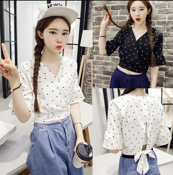 ★小编点评:韩版圆点雪纺衫加上V领设计还有后背的略开设计,让你清凉又时尚哦~短款的雪纺衫让你时尚感倍增,喇叭袖和夸张的蝴蝶结显得俏皮,是走在时尚前端的MM必备的圆点雪纺衫哦~