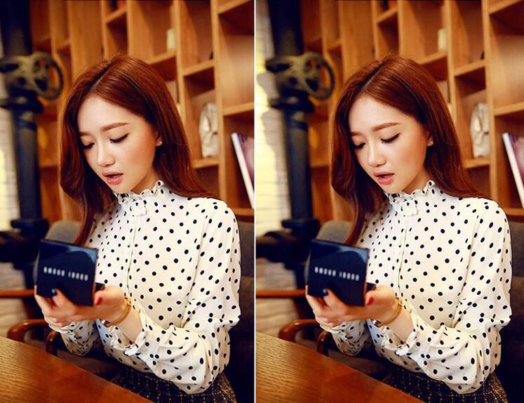★小编点评:这款2016韩版女装雪纺衫融入了圆点这个流行元素,配以荷叶边圆领,尽显淑女风范,薄薄的长袖圆点雪纺衬衫,春夏两季都适合哦~