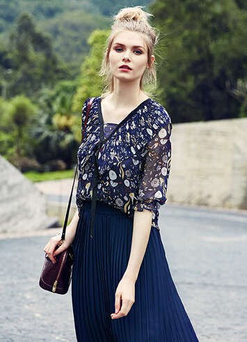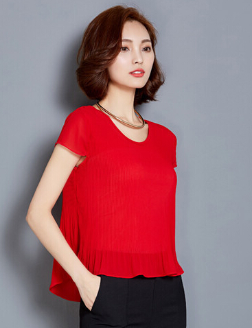【女装雪纺衫款01】精致的领口设计,细腻的百褶设计都让整件雪纺衫充满魅力,衣服的流畅剪裁还能修饰出玲珑有致的身材曲线,将知性妩媚的女人气质发挥得淋漓尽致,透气的材质更是能给人最为舒适的穿着享受。
