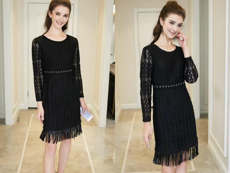 这是一条黑色的流苏连衣裙,黑色本就显瘦,加上直筒的版型更是修身,简约的圆领设计经典时尚,腰间蕾丝印花设计优雅迷人,镂空的袖子使肌肤若隐若现,增添一丝神秘美感,裙摆上的流苏装饰浪漫唯美,加上舒适亲肤的面料让裙子看起来更有质感。