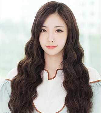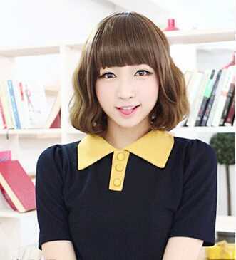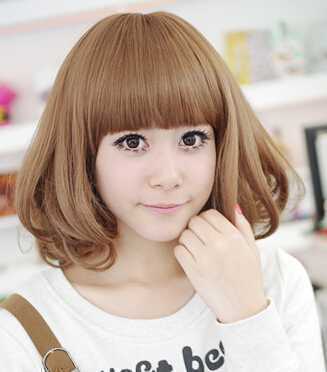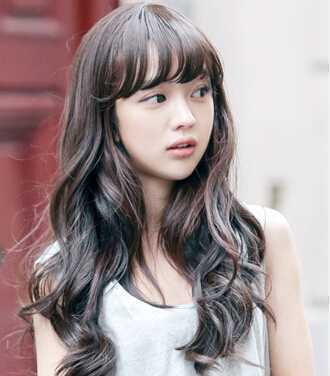 括弧型的内扣刘海正好遮住额头,起到了很好的修饰脸型的效果,让原本圆润的脸型凸显立体感,蓬翘的波浪卷发配上可爱的齐刘海,打造韩式清甜萝莉。