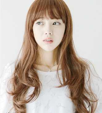 亮棕色非常衬肤色马上提升女生气质,曼妙的长卷发,简约的层次增加无限魅力,可爱的A字刘海塑造V脸,柔美韩式时尚感。