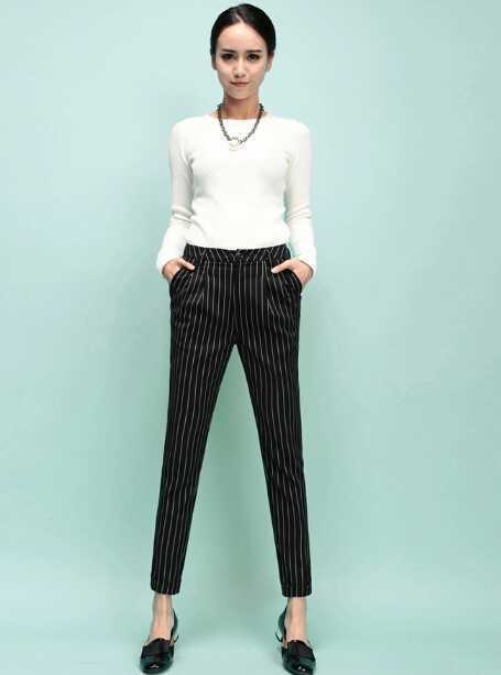 竖条纹能够很好地修身塑体型,深色系与竖条纹并存的休闲裤就更显瘦了,九分裤的长度正好露出你腿部最显瘦削的脚踝,这时配搭一双小皮鞋或高跟鞋就更显瘦显高了。