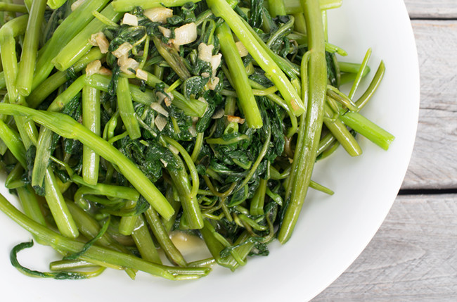 2:烧热炒菜锅,热锅里下油,把切好的蒜末倒入油锅里煸香,倒入空心菜,加点水,盖上锅盖用大火煮1分钟。