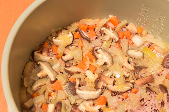 2、饭煮开后就加入冬菇,加一点油,到水差不多快干的时候加入腊肉;
