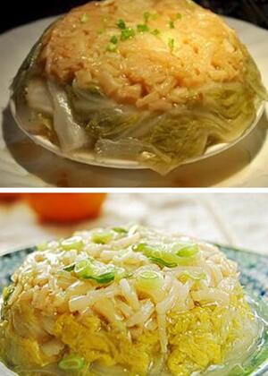 4、把蒸出来的汤汁倒出,加入盐和生粉搅拌,放入锅里煮开,把白菜倒扣在另一个盘子里,淋上汤汁即可。