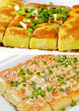 7、倒入蛋液,等蛋液稍凝固些时把整个翻过来,用铲子轻压,再翻过来稍微烘一下。