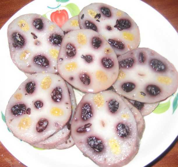 做法:把黑米洗干净,用清水浸泡几个小时,把莲藕洗干净去皮切掉一端的顶部,然后把黑米寒进莲藕的孔里,再把切下来的顶部用牙签固定,然后放入蒸锅里蒸半小时,取出,放凉后切成片,再撒上白糖就可以吃了,黑米蒸莲藕就做好了。