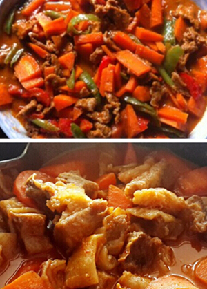 用料:牛肉200克,柿子椒1只,红椒1只,胡萝卜半根,酱油1茶匙,料酒1茶匙,淀粉1茶匙咖喱,50克,椰奶1罐,白糖适量,鱼露适量,水适量。