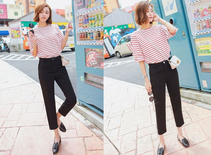 英伦风搭配01》》》》》青春活力的横条上衣十分地适合盛夏,宽松的版型尽显休闲风格,搭配着显瘦的修身小西裤充分地彰显出复古迷人的英伦时尚感,而亮皮的平底鞋更是为整个造型起到加分的作用喔。