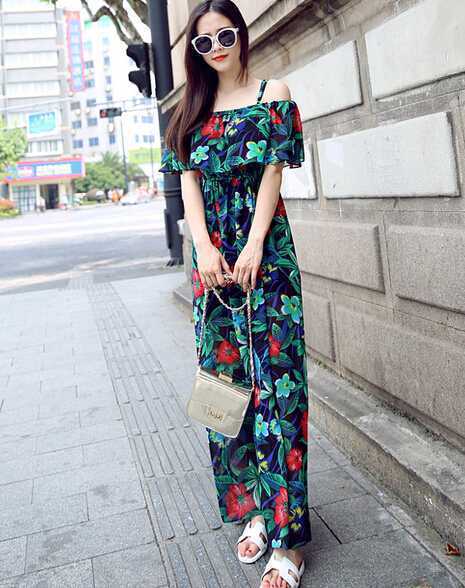 度假风夏季一字领花朵长裙, 一字领设计露出锁骨显有野, 搭配沙滩白色拖鞋,舒适又凉爽, 随意拎着亮点包包,瞬间提升整体造型时尚度,戴上 出游必备墨镜,酷毙了。