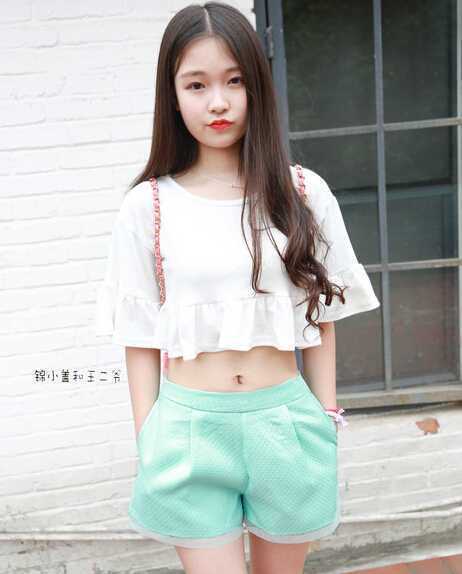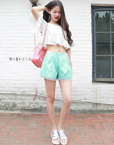 荷叶边夏季超短款露肚脐t恤衫,荷叶边装饰着增添时尚度,搭配薄荷绿雪纺短裤,秀出纤细美腿之余显高挑,闪亮银色凉鞋时髦个性,穿出性感时髦个性造型。