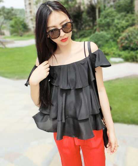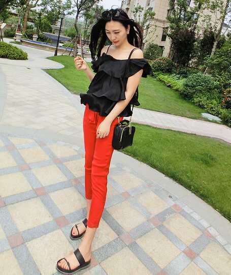 露肩黑色上衣微露小香肩,秀出属于你的小性感,搭配艳丽红色的紧身裤,巧妙藏住你腿上的赘肉,很显瘦,加上一对黑色拖鞋和包包,轻松hold住时尚咯。