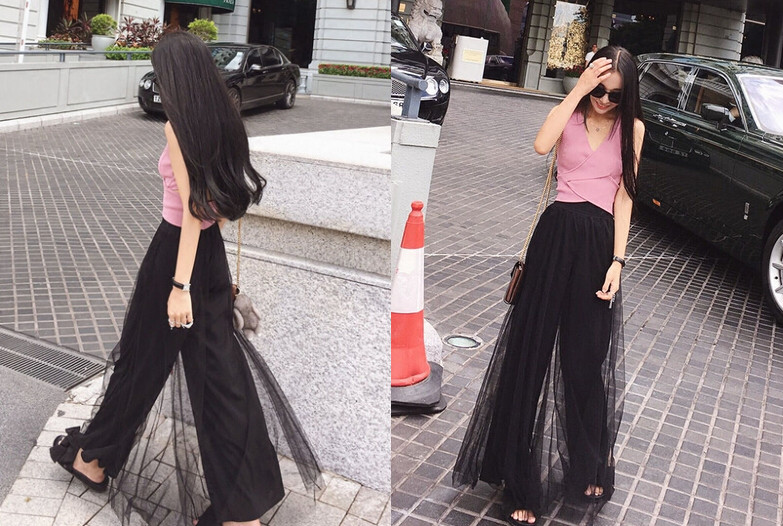 【显高搭配04】单是欧根纱的阔腿长裤就已经能很好地显高显瘦,紧身的粉色上衣性感有型,而在独特剪裁的裤子搭配下真的将人的身高无限拉长,整体的搭配不仅有修身效果而且超级显腿长喔!
