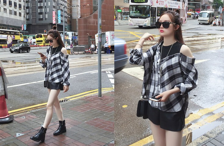 【显高搭配01】这款颇有心机的服装搭配是最具朋克风范的。流行的宽松格子衬衫拼接着一个小背心,穿出了两件式的搭配效果,而下身配上一条高腰的短裤,瞬间就调整了身材比例,再来一双马丁靴立显腿长,轻松就赚足回头率!