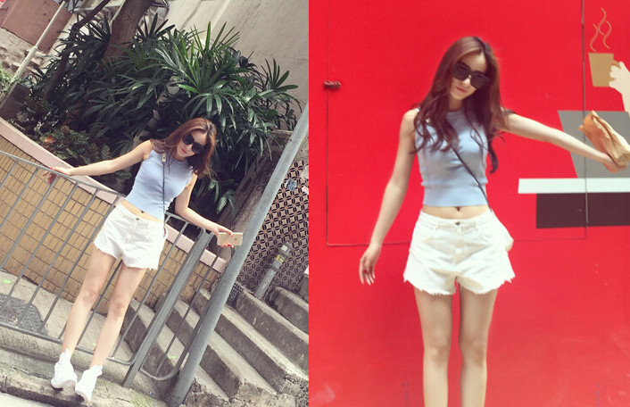【显高搭配03】短款的针织紧身上衣尽显玲珑有致的好身材,在高腰白色短裤的配合下简约大方,露脐的设计十分地性感,而在白鞋的搭配下会令你的小身板更显清瘦高挑,一不小心就成了街拍的时尚标杆。