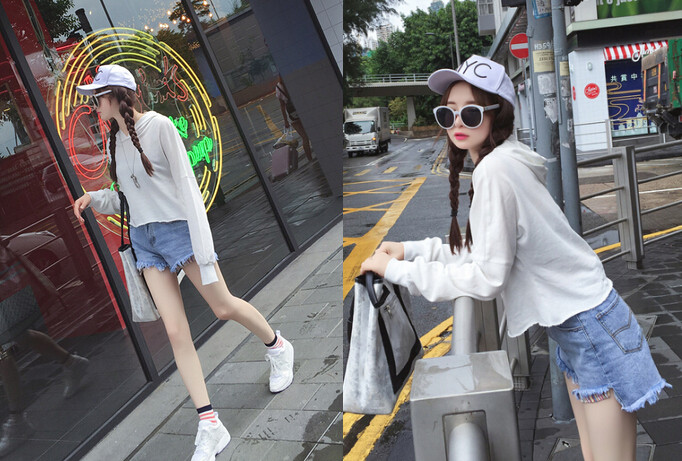 【显高搭配02】韩版的白色上衣休闲随意,整体看上去十分地时尚,而搭配着高腰的牛仔短裤让整个造型看上去非常地有腔调,一双白色的球鞋尽展青春活力,而上短下长的搭配是最能轻松显高的,非常耐看!