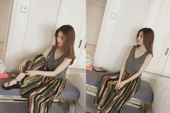 显瘦搭配04》》》》》夏天怎能不来一件凉爽的背心上衣呢?军绿色的深v背心时髦好看,搭配着松紧腰的条纹阔腿裤,一下就彰显夏日清凉感,完全没有束缚感的搭配款式不仅能显瘦,还能让你成为夏日里的焦点喔。