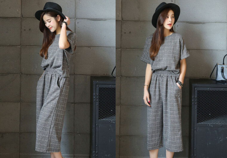 显瘦搭配02》》》》》除了竖条的连衣裙能显瘦之外,阔腿型的格子套装也是相当不错的喔!棉麻的短袖上衣宽松舒适,搭配着七分的阔腿裤,瞬间就将身材修饰得更好,拉高腰部线条,遮盖住小粗腿,轻松显瘦。