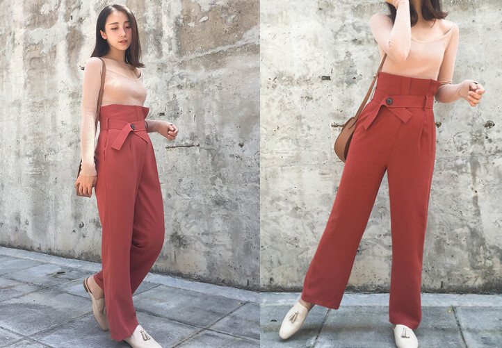 【秋季胖子搭配05】紧身的藕粉色上衣凸显出玲珑有致的身材,而高腰阔腿裤的搭配能轻松掩盖胖美眉的身材,立显高瘦的好身材,而整体的搭配彰显着复古摩登的潮流风格,一双白色的平底鞋与整个搭配相互相成,十分好看!