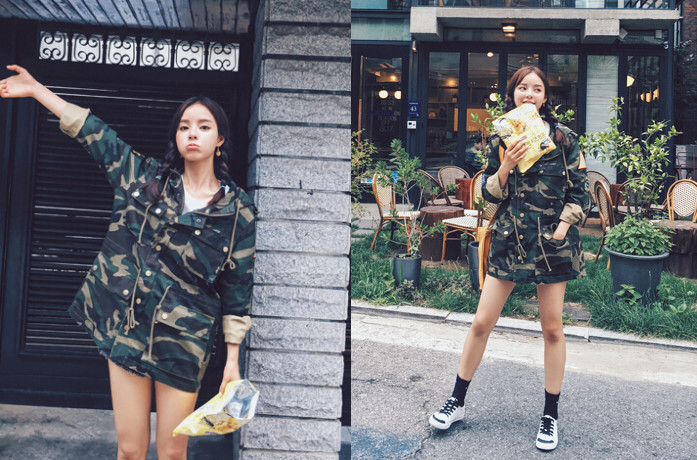 【秋季胖子搭配02】上长下短的服装搭配一向都是秋季里最为潮流的搭配技巧,迷彩的大风衣款式宽松有型,给人一种简单的时尚感,而白色的内搭以及白鞋黑袜的配合更显青春活力,彰显着无与伦比的街头大牌风格,还能轻松显瘦,十分地好看。