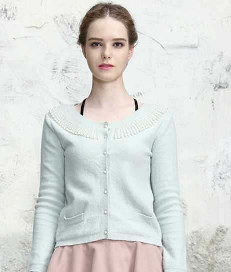 亲近大自然的浅绿色,愉悦了你的心情,蕾丝边的领口设计,带给你一种甜美清淡美感,浅色系的针织衫很百搭,搭配深色系的蓬蓬裙甜美再度升级,想要淑女深林系装扮,这么穿就对了。