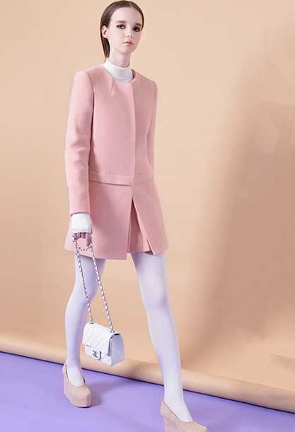 优雅含蓄的小圆领,奢华高档的嫩粉色毛呢绒,冬日穿起来甜美温馨感倍增,内搭白色高领针织衫,散发甜美感十足,下身搭配白色丝袜和裸色高跟鞋,在甜美中透露出小性感。