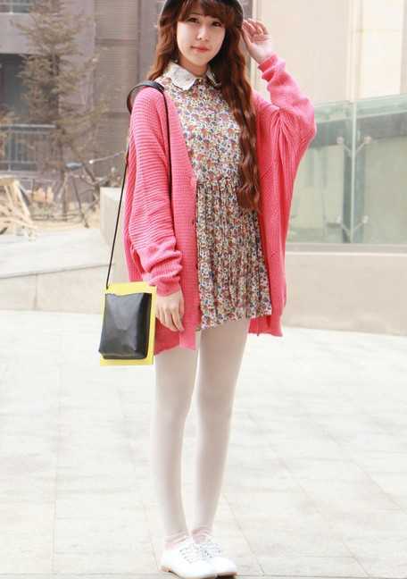 春季粉红色蝙蝠袖针织开衫,搭配小碎花连衣裙,是最佳的搭配组合,甜美又显俏皮感,穿出最洋溢的春季装扮。