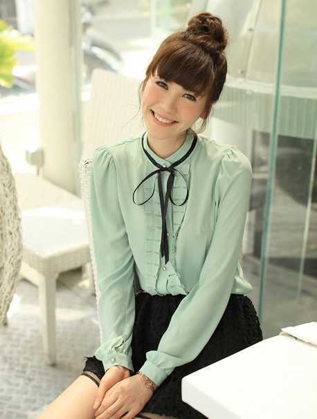 春季薄荷绿雪纺衬衫,黑色蝴蝶结点缀着,很可爱俏皮。