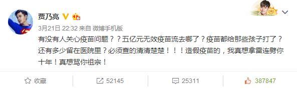 中国非法疫苗事件全面爆发,因为非法疫苗受害的孩子接连曝光,叫人心酸,引得娱乐圈众星关注,身为父亲的贾乃亮更是难忍怒气,在微博上爆粗口斥责卖假药者。