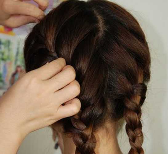 2、如图,把右边区分好的又发,编织成麻花辫,在编到下一股头发的时,分别从两旁各加进一束头发的方法进行编织。
