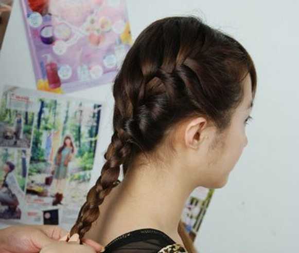 3、按照上一步同样的编发,把另一侧的头发加股辫,这时把左边的头发扎起来。