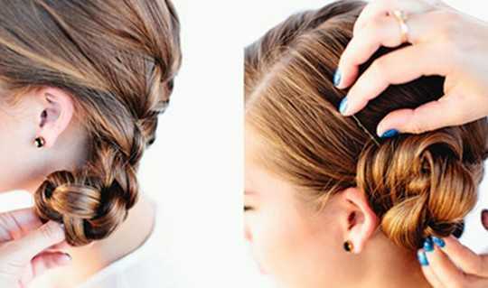 step7:将编好的辫子从发尾处内卷弄成花苞形状。