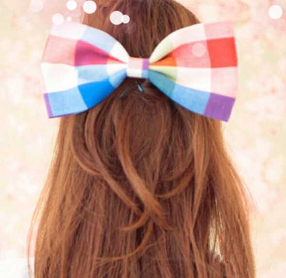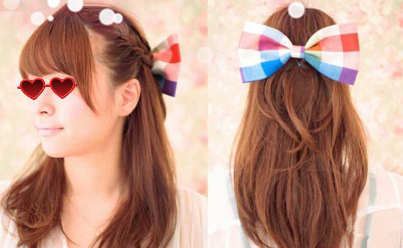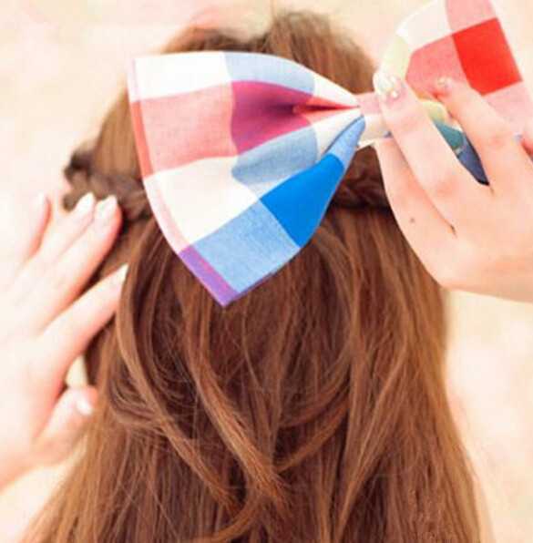 步骤四:再佩戴上一个彩色格子发饰遮住编发的小黑夹接口位置;