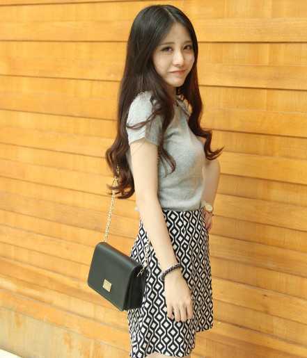十分显清新气息的中分长卷发,中分刘海,卷卷的发丝散落在肩上,增添了美感,小清新风,短袖衫+包臀半身裙,挎着包包上街,超显淑女气质的哦!