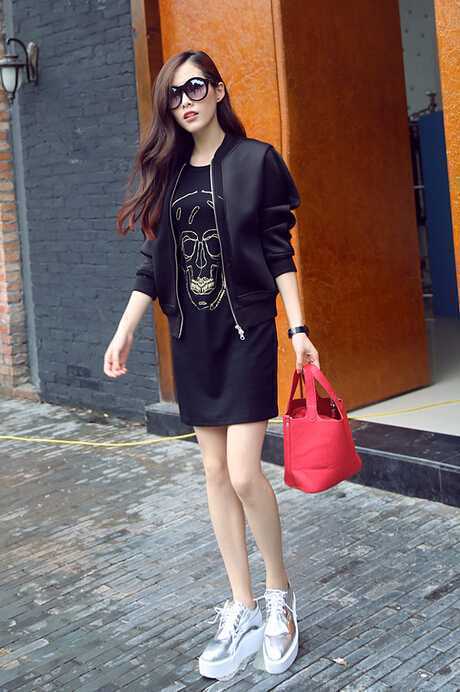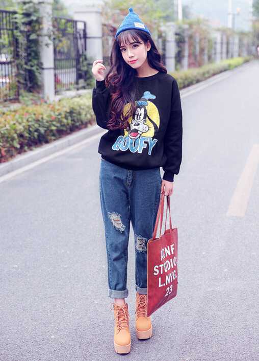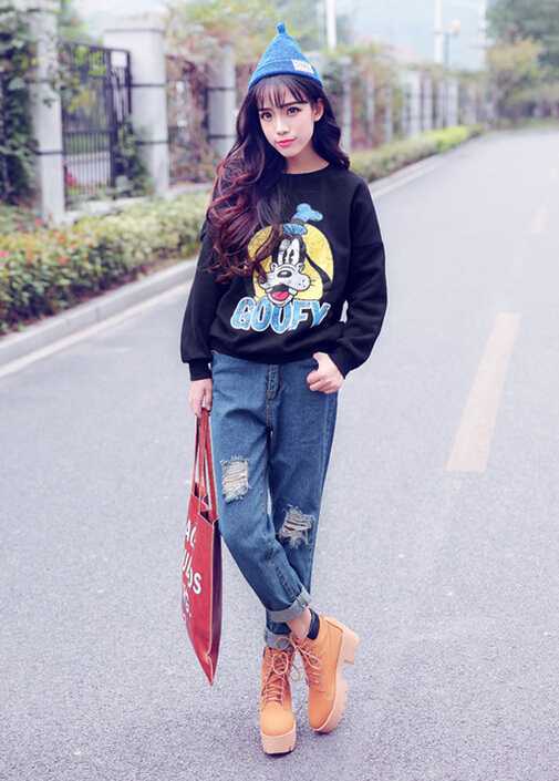 再搭配上韩国版气质高飞狗狗案印花卫衣和破洞裤、厚底鞋,潮流味道挡也挡不住啊!十分时尚!