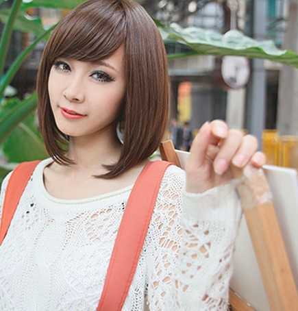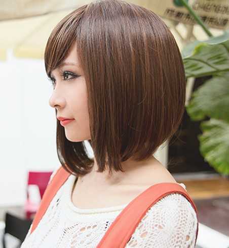 前面是斜开的刘海,显得十分甜美,浅棕发色,更是增添了时尚潮感,两颊内扣式短发尾,起到十分好的修脸效果,还带点俏皮感。