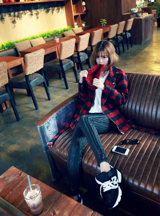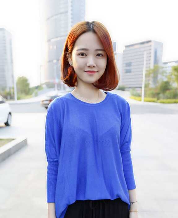 发型点评:整齐的平刘海搭配齐肩的凌乱蓬松发尾短发,十分有个性,在阳光照耀下,光泽十足又显动感,韩式妹纸都会搭配针织尖帽和大圆眼镜搭配的哦!