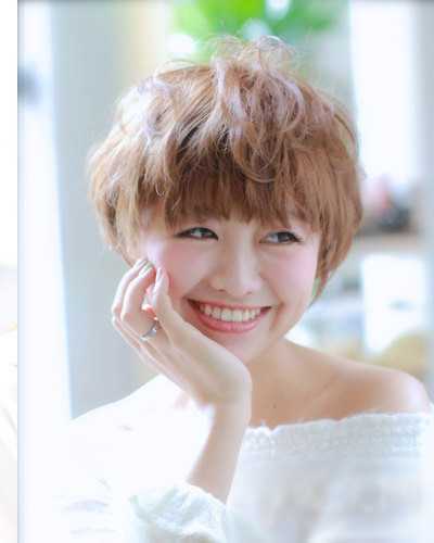发型点评:细碎的齐刘海搭配蓬松凌乱的碎发尽显女生呆萌可爱的气质,干净利落的短发没有一丝繁重感,清爽美腻,金橘色的发色明亮动人,超好打理。