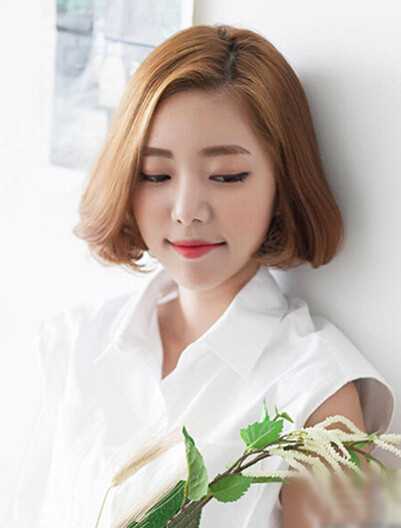一款非常新潮的韩式短烫发,微烫的发尾清新别致,搭配三七分的长刘海,能有效地修饰脸型,一侧别在耳后清爽大方,金橙色的染发不仅时尚吸睛,将皮肤也衬得十分白皙。
